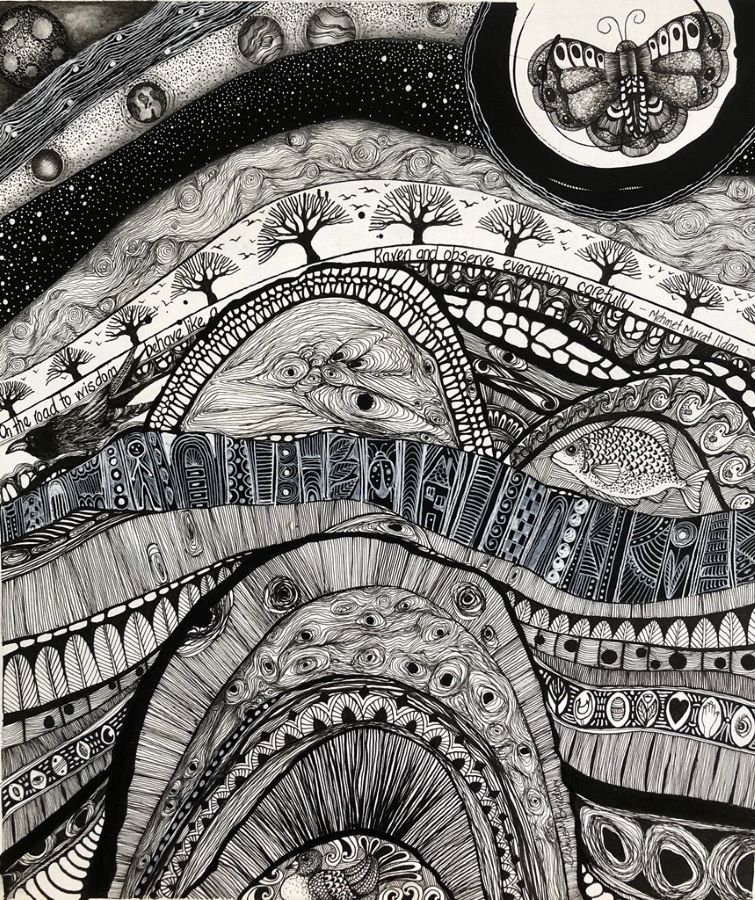 This is an original drawing which is part of my mindfulness series. It is a record of a day dream. I often sit with pen in hand and just let my mind wander and record what ‘pops’ into my head.